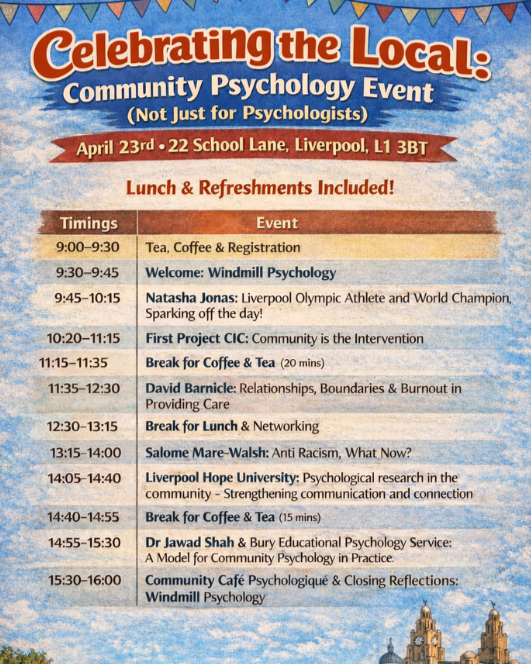 Windmill Psychology serves as a hub of support, helping community organisations share knowledge, access psychological expertise, and collaborate in ways that sustain both their teams and the communities they serve. Our activities include hosting a Café Psychologique, where people gather for open conversations about everyday psychological themes in a relaxed, inclusive setting. We also plan to run workshops designed to support those in community roles, explore resilience, and translate psychological ideas into practice.